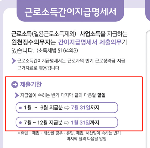 아래 그림과 같이 근로 소득 간이 지급 명세서는 1년에 2번 제출해야 합니다. 실무를 하는 입장에서 1년에 2번뿐이라고 하지만 솔직히 부담이 되는 작업이긴 합니다. 이유인즉슨 잊어버리는 겁니다. 뒤늦게 생각이 난다고 해도 제출시기를 한 시간이라도 초과하면 가산세가 징수되는 부분이어서 실부를 하는 저도 매년 달력을 받으면 꼭 수기로 메모해 놓았던 기억이 있습니다.