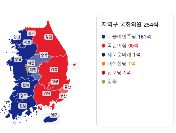 어제는 22대 국회의원 선거 날이다. 오늘 오전 선거 결과를 보면 거대야당 민주당이 175석으로 압승했고 전국은 정확하게 반으로 나눠졌다. 이 부분은 아래의 이미지를 보면 모두 공감이 갈 것이다.